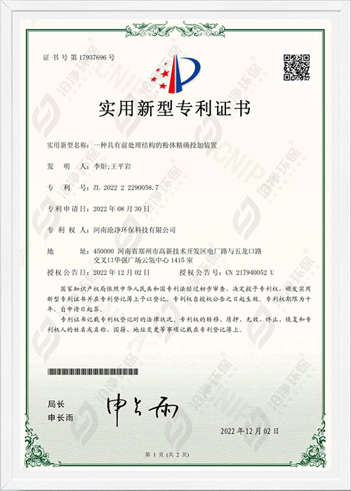 滄凈環保,是一家集科研、設計,工程施工、調試于一體的智能粉體投加系統-國家級高新技術企業【編號:GR202341000885】,旗下產品涵蓋水處理、危廢固廢處置,脫硫脫硝處理等領域,且通過ISO 9001:2015質量管理體系認證。